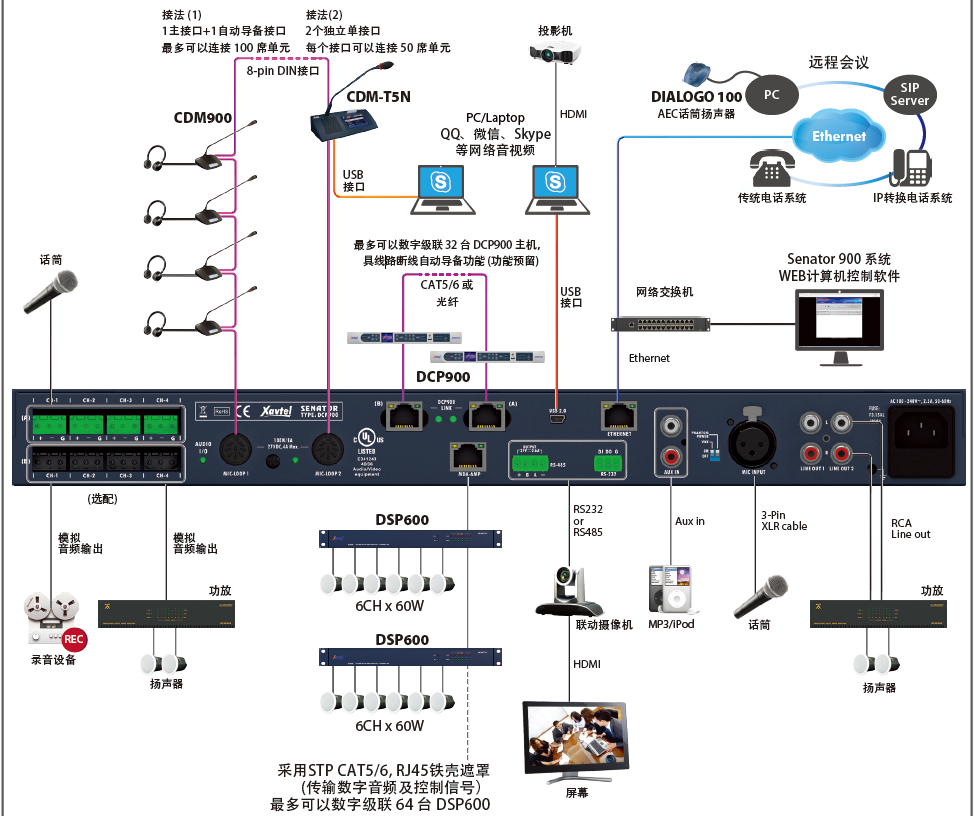 每一台 DCP900 主机前面板标配 1 个 USB 口,支持播放或录音功能。1 个耳机插口用来播放录音的内容。背面标配有 1 组立体声 输入+1个标准 XLR 话筒/线路输入,2组立体声输出,2个音频卡插槽(可选配4通道音频输入或4通道音频输出),藉以扩充其它的 音频信号,支持摄像机联动 (RS485/232,Pelco/Visca通信协议)。系统最多可以经由 CAT5/6 或光纤接口,数字级联 31 台 DCP900主机,实现多会议室之间的实时无压缩高质量音频传输。可选配回声抑制 AEC卡,用来消除远程会议的二次回音。支持 网络VoIP 音频传输SIP协议,可以常用的QQ、微信、SKYPE作为远程会议工具。